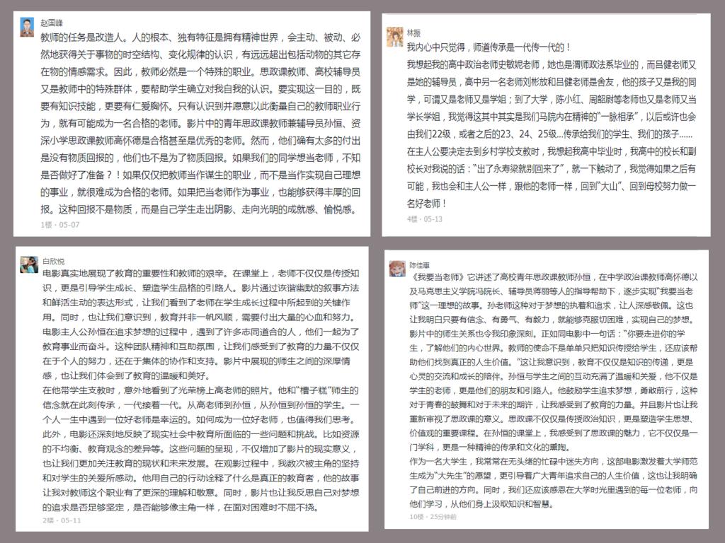 观影后,公司按计划在公司内部网络论坛开设了观影交流专题。截止发稿,已有三十多名以党员、入党积极分子、发展对象为主的师生从不同的角度,结合自己工作或未来职业规划,主动跟帖发表观影心得,就思政课教师、辅导员应有的素质,或自己遇到的好老师,或个人的不足与努力方向,或对思政课教师职业特殊性的认识等畅谈观点,分享收获,公司师生阅读量已达450多人。
