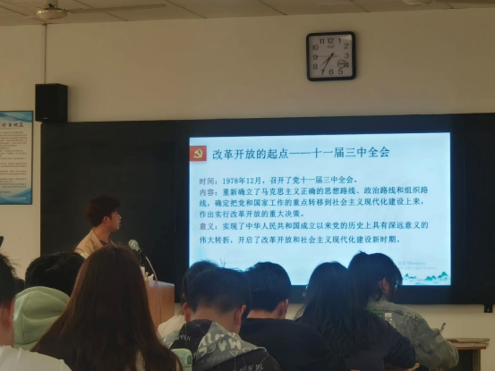 为了进一步增强思政课程教学的时代感和吸引力,打造员工“真心喜欢、终身受益”的《毛泽东思想和中国特色社会主义理论体系概论》课程。2024年4月15日下午,肖宝荣老师依托思政课课程特色,以“改革开放前后衣食住行变化”为主题,组织历史本222优师班和生物本223优师班同学自行分组,查找资料,结合所学知识和生活实际进行成果展示。