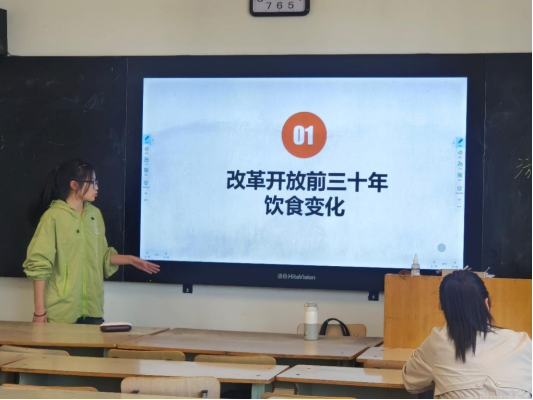 首先是小组代表进行展示,同学们就“改革开放前后变化”的大主题分别展示了“改革开放以来中国女性服饰审美的变迁”、“改革开放前后住房变化”、“改革开放以来服饰变化”、“改革开放以来‘食’的变化”“改革开放对教育的影响”,“改革开放前后身份证明的变化”等内容。整个展示过程效果良好,从中可推断每组同学都是经过仔细斟酌,集体合作,查阅了大量资料,展示内容有颜值、有温度、滴灌式、入脑走心。