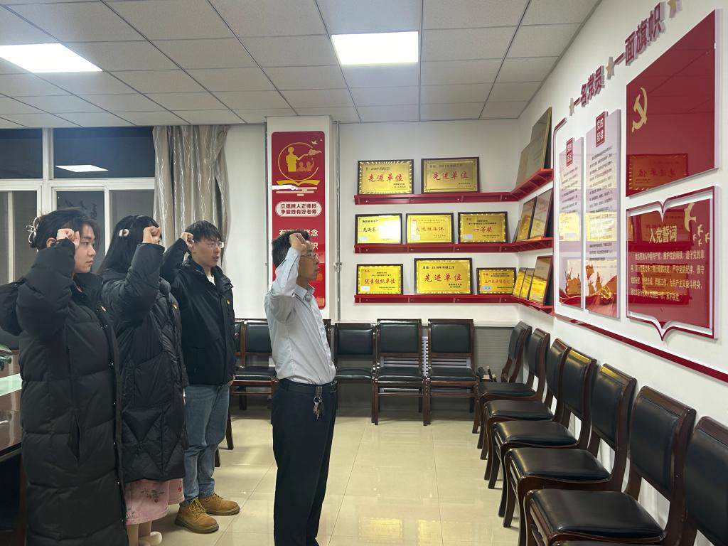 12月14日,党支部在公司党员活动室举行了该三名同志入党宣誓仪式。仪式上,党支部书记赵国峰为三名同志发放、佩戴了党员胸章,带领三人面向党旗诵读了入党誓词,并讲话。