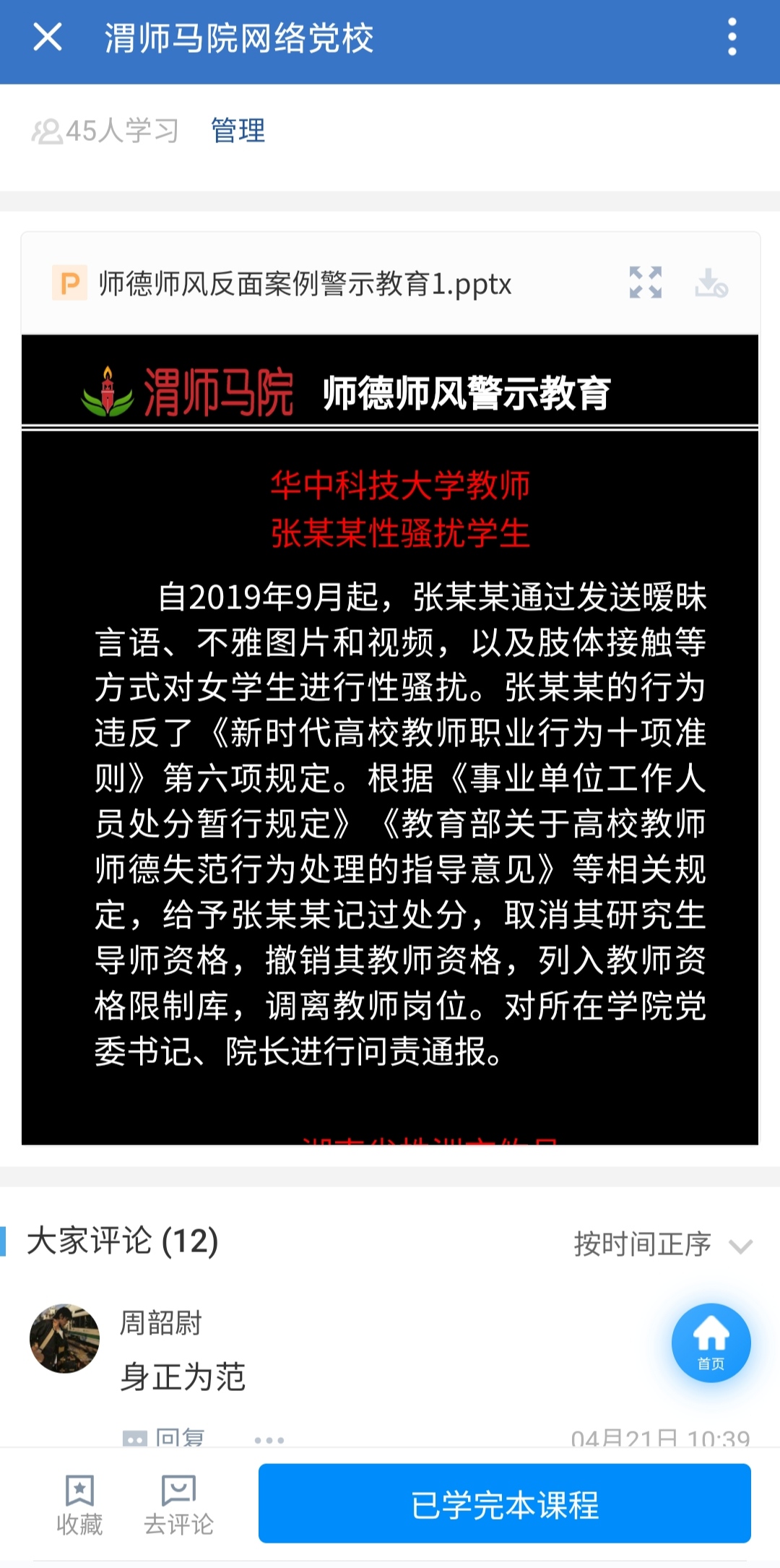 网络课程后台数据显示,截止本文发稿,应参加学习的在岗50名教师中,白赵峰等41人认真阅读了反面案例。4人学习时间少于正常学习时间,存在学习不深入的可能。5人未学习,公司已单独另行组织学习。周韶尉等12名教师在课程评论区发表了学习心得,表达了对教师队伍害群之马的憎恨和引以为戒的决心。5名未学习的教师,公司另行单独组织了学习。