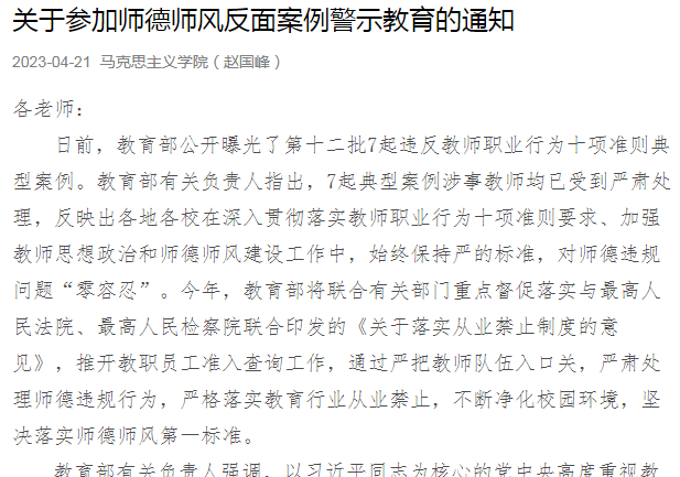 在推送的警示教育图文中,公司强调,党的二十大报告明确指出,要加强师德师风建设,培养高素质教师队伍,弘扬尊师重教社会风尚。教育部、公司对对师德违规问题始终持“零容忍”态度,对一切师德违规行为都要严肃处理。希望公司教师明确师德师风第一标准,认真自查自纠,从反面案例中吸取教训,自觉自律。