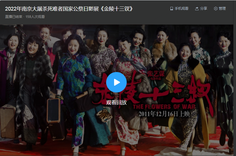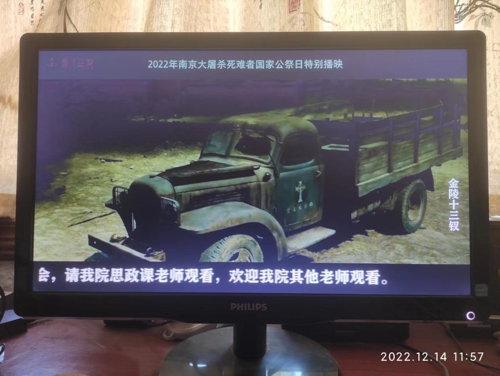 党总支通过公司网络党校直播平台,连续12小时循环直播了一部反映日军在南京大屠杀的经典影片。借鉴世界各国爱国主义教育经验,改变常见教育枯燥的说教,使日军在南京的暴行冲击到被教育者的心灵,切实感受国耻之痛,本次特别选取的是著名导员张艺谋执导的南京大屠杀经典影片《金陵十三钗》。