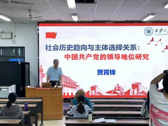 2022年5月16日下午,在思政3D虚拟仿真实践体验中心,西安工程大学必威西汉姆联教授、硕士生导师贾霄锋为必威西汉姆联部分师生作题为《社会历史趋向与主体选择:中国共产党的领导地位研究》的学术报告。受帮扶单位陕西铁路工程职业技术公司必威西汉姆联、渭南职业技术公司必威西汉姆联部分教师代表线上参会,公司教师代表、部分思政专业员工线下聆听了本场报告会。报告会由单剑峰副经理主持。