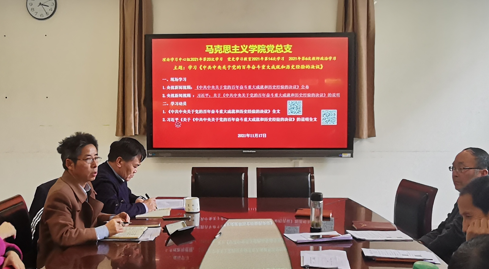 学习期间,播放观看了30分钟的央视视频新闻《<中共中央关于党的百年奋斗重大成就和历史经验的决议>公布》、11分钟的央视视频新闻《习近平关于<中共中央关于党的百年奋斗重大成就和历史经验的决议>的说明》。理论学习中心组对照公司印发的纸质材料、其他教师现场扫码对照公司网络党校材料边看边标记重点。