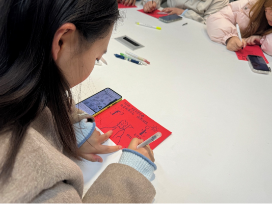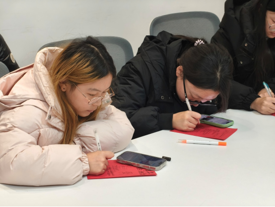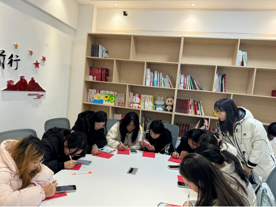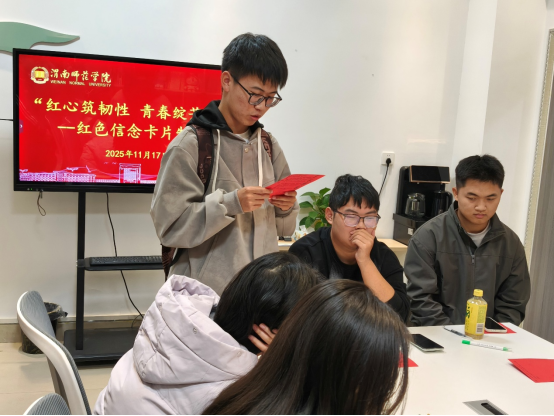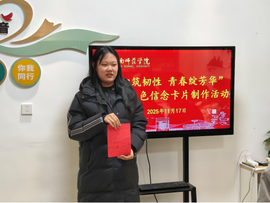 活动现场,红色榜样事迹片段铺就精神底色,学子们手持红卡双向书写:正面誊录榜样的坚韧故事,让先辈的“韧性密码”落地生根;反面记录当下的压力困惑,让情绪有了栖居之所。笔锋起落间,有人以简笔画为卡片添彩,有人借文字为信念注脚,红色的纸张上,既有精神的传承,也有青春的鲜活。