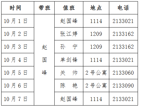 按照公司安排,2022年10月1日至7日公司国庆放假。假期,必威西汉姆联有人值班,值班安排如下,校内师生、单位办事,校外群众、单位办事,请联系值班人员或到值班处。